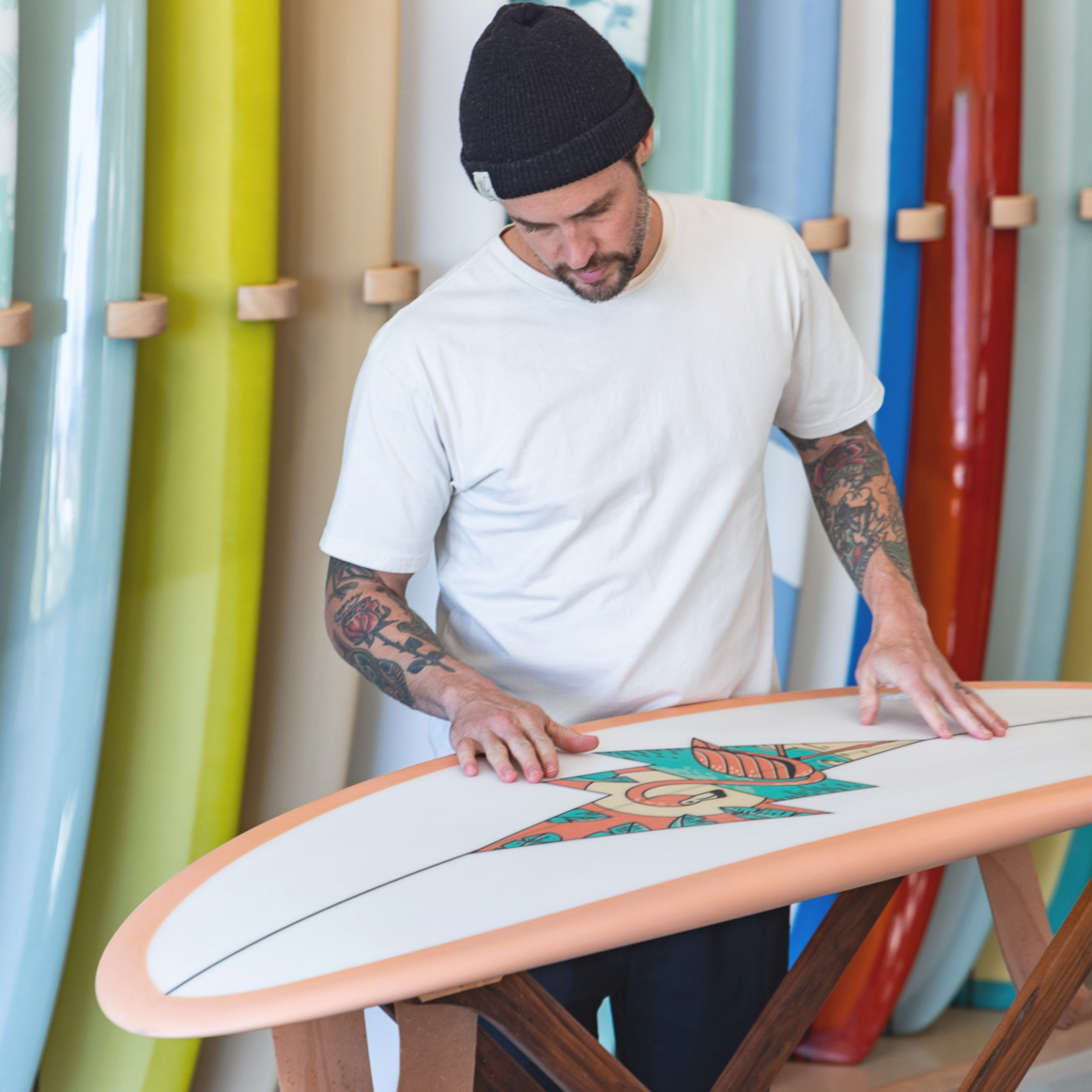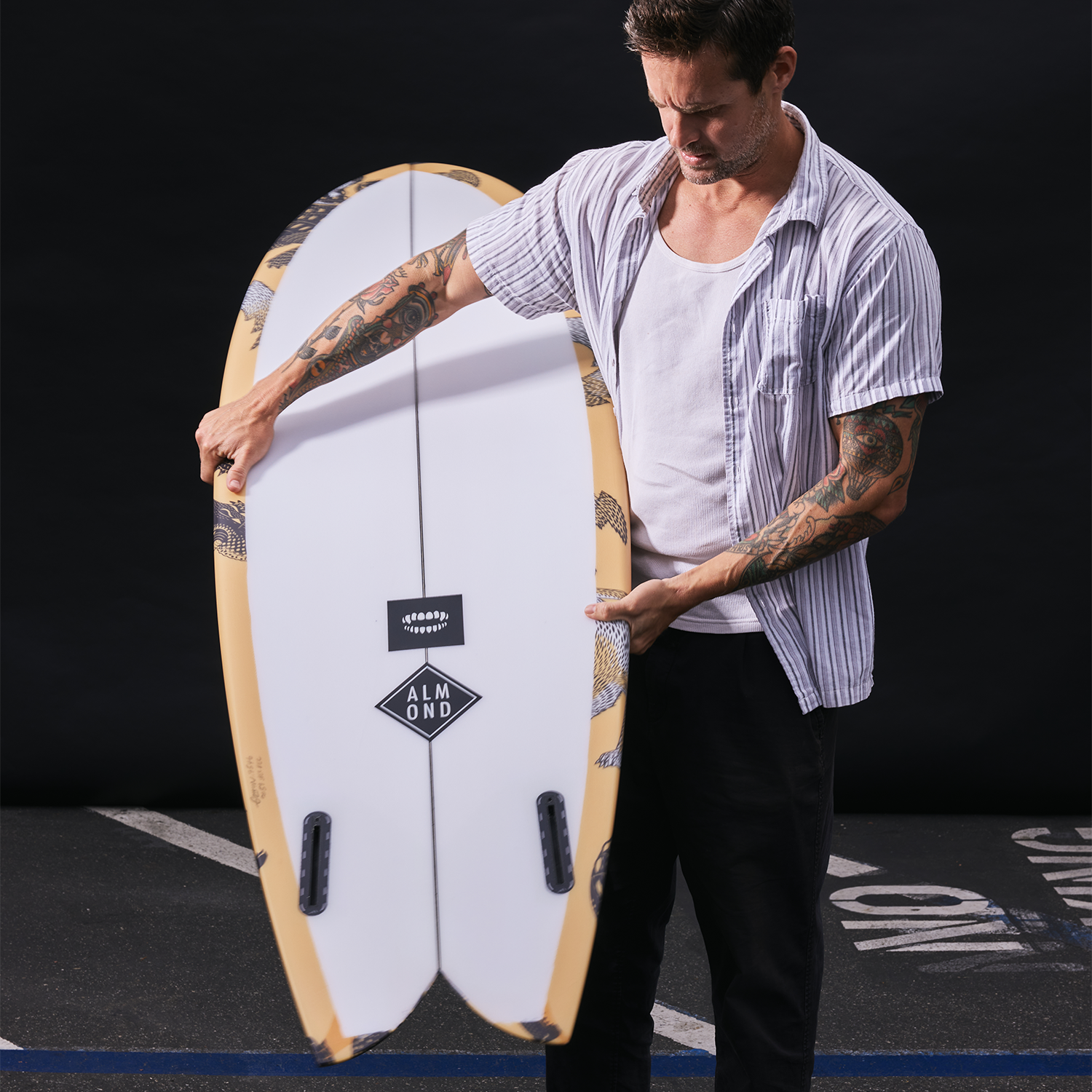Chomp x Almond collection features unique are paired with high quality surfboard craftsmanship. Each board is handshapped, glassed and ready to rip fresh out of the box.